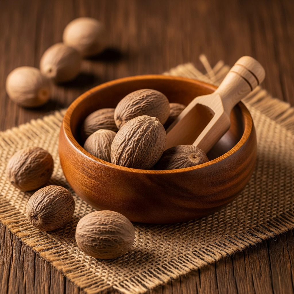 Nutmeg, locally known as Jaiphal, is the dried seed of the Myristica fragrans tree. Native to the Spice Islands of Indonesia, nutmeg is now cultivated in tropical regions like India (especially Kerala). Known for its warm, sweet, and slightly nutty flavor, nutmeg is used in culinary, medicinal, and cosmetic applications.